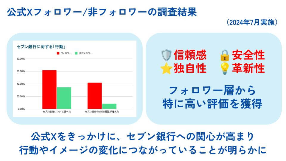 2024年7月にXのフォロワーと非フォロワーの比較調査を行った結果、フォロワーの方が当社への関心やイメージの良さが明らかに高いことがわかりました。たとえば、フォロワーの方がセブン銀行について自主的に調べたり、Webサイトを訪れる割合が高く、当社に対し「独自性」「革新性」などを感じている人の比率も非フォロワー層より大幅に上回ったんです。