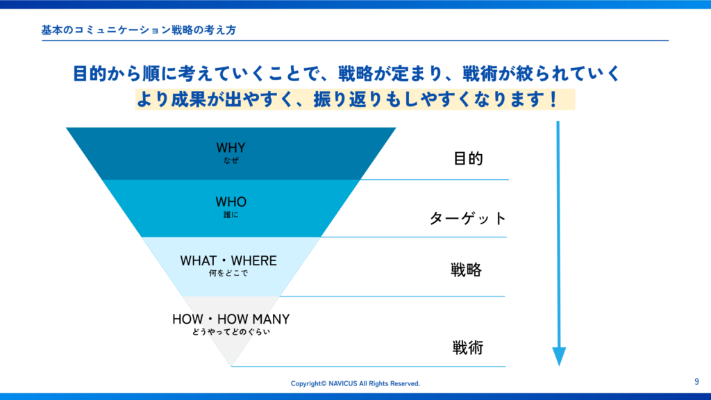 - 目的(WHY)から順に考えることで、戦略と戦術が絞られ、成果と振り返りがしやすくなる