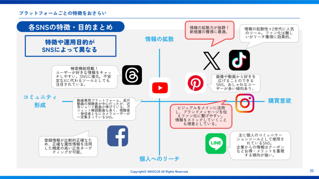 図:各SNSの特徴と運用目的の比較まとめ