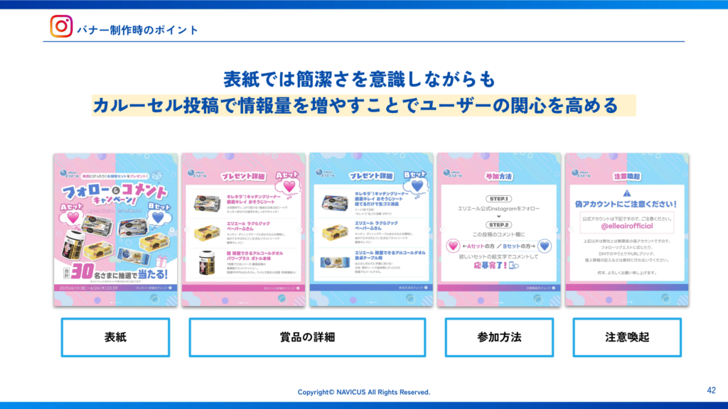 図:Instagramカルーセル投稿におけるバナー構成例(表紙・賞品詳細・参加方法・注意喚起)