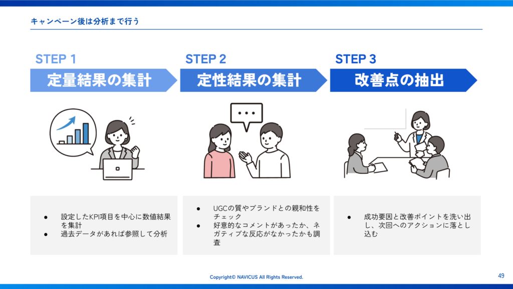 キャンペーンは、実施して終わりではなく、分析まで行って次につなげることが重要です。分析は次の3ステップで進めます。