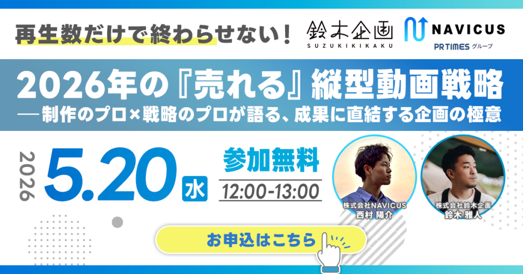 SNS戦略設計を軸に企業様や地方自治体様のコミュニケーション支援サービスを提供する株式会社NAVICUS(本社:東京都千代田区、代表取締役:武内 一矢、以下:NAVICUS)は、株式会社鈴木企画と共同で、無料ウェビナー「再生数だけで終わらせない!2026年の『売れる』縦型動画戦略〜制作のプロ×戦略のプロが語る、成果に直結する企画の極意〜」を、2026年5月20日(水)に開催いたします。